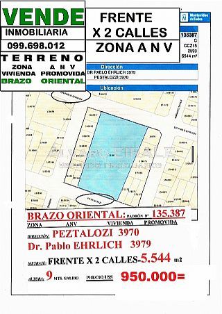 LOCAL INDUSTRIAL con TERRENO de 5.544 m2 EN BRAZO ORIENTAL sobre la calle PEZTALOZI 3970 y sobre la calle ERLICH 3979 con FRENTE X las 2 CALLES. PARA RECICLAR TOTALMENTE . IDEAL PARA TODO TIPO DE ACTIVIDAD INDUSTRIAL, COMERCIAL, PARKING, CASA MAYORISTA, COLEGIO, GIMNASIO. <<SE COMPARTE CON LOS COLEGAS>> *VENDE INMOBILIARIA: Àlvaro EIRALE OCAMPO 099.698.012 Y 094.698.012 SERVICIOS INMOBILIARIOS en URUGUAY desde 1986. https://ALVAROEIRALE.COM.UY alvaroeirale@gmail.com COMISION INMOBILIARIA 3 % + IVA RUT21789274001